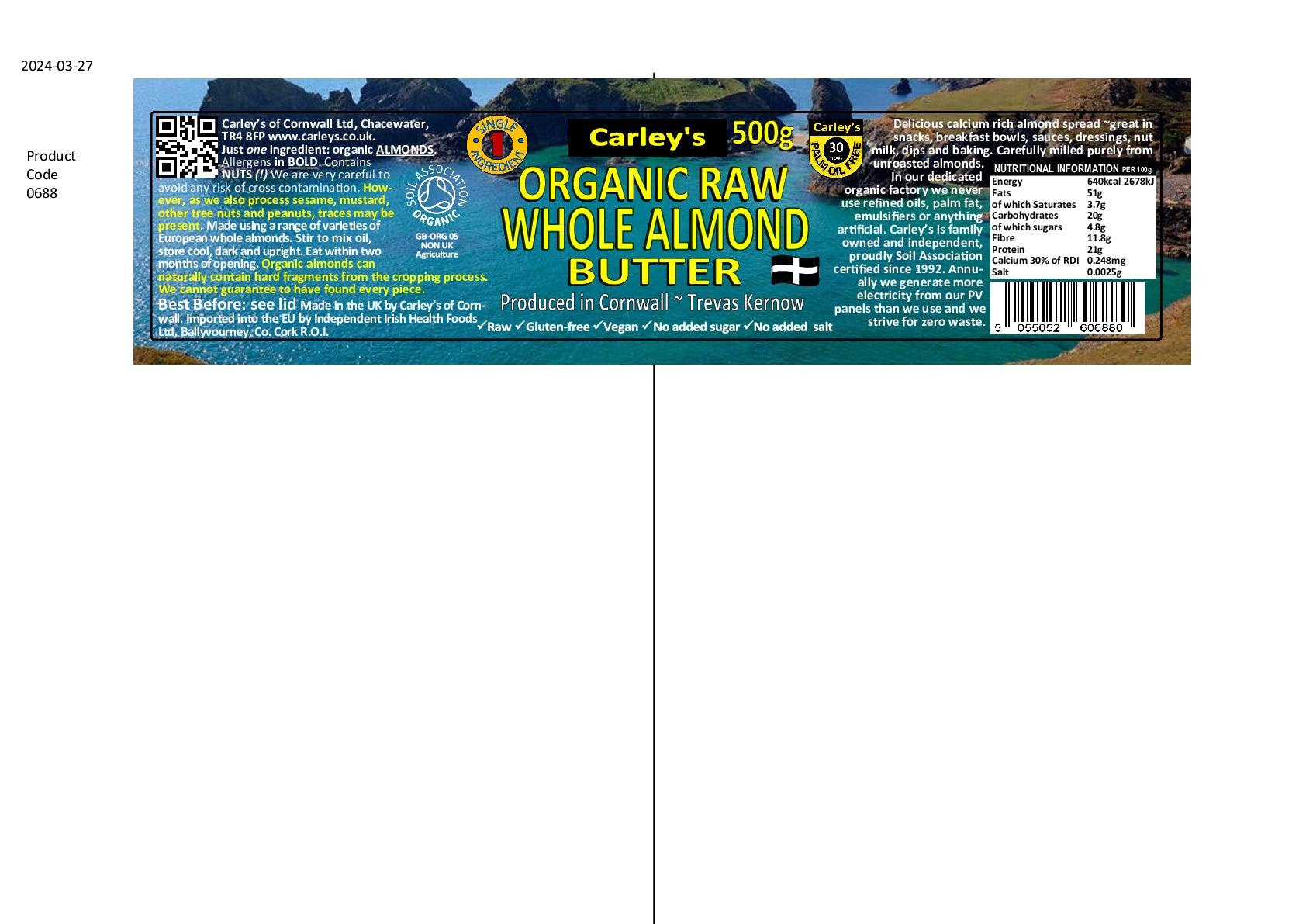 Carley's Organic Raw European Almond Butter in a 500g size.