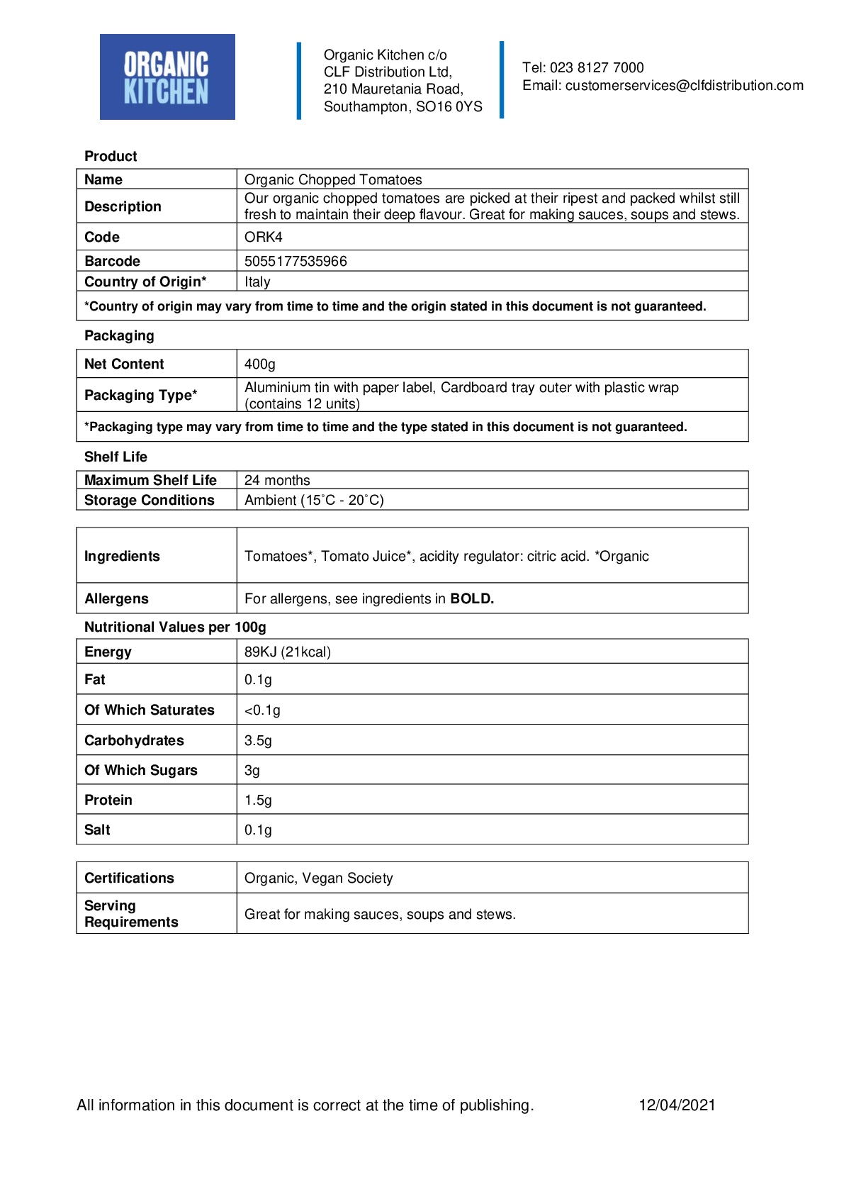 Our organic chopped tomatoes are picked at their ripest and packed whilst still fresh to maintain their deep flavour. Great for making sauces, soups and stews.