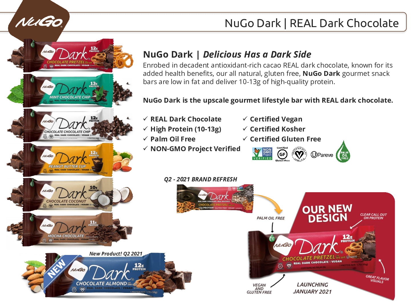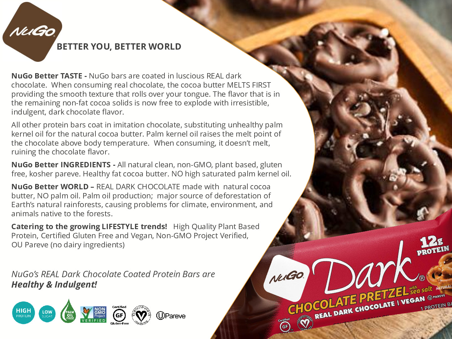 Every NuGo Dark bar is made up of a delicious protein packed crispy inside dipped in decadent, antioxidant-rich, 100% real dark chocolate that melts in your mouth with delectable flavour. All NuGo Dark scrumptious flavours are GF, vegan, OU kosher pareve and non-GMO verified.