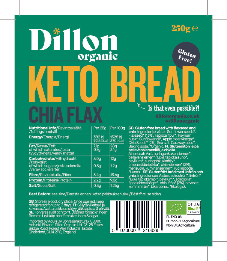 This is our Chia Flax Organic Keto bread made with a blend of chia, flax, sunflower seeds, and caraway seeds for flavour. It comes as an unsliced half loaf and that gives you the freedom to choose which thickness you'd like to make your slice. Great toasted or double toasted and made into an open sandwich. It is delicious tasting bread that helps keep you fuller for longer, and replaces the need to reach for a high carb loaf with a healthy, keto based alternative.