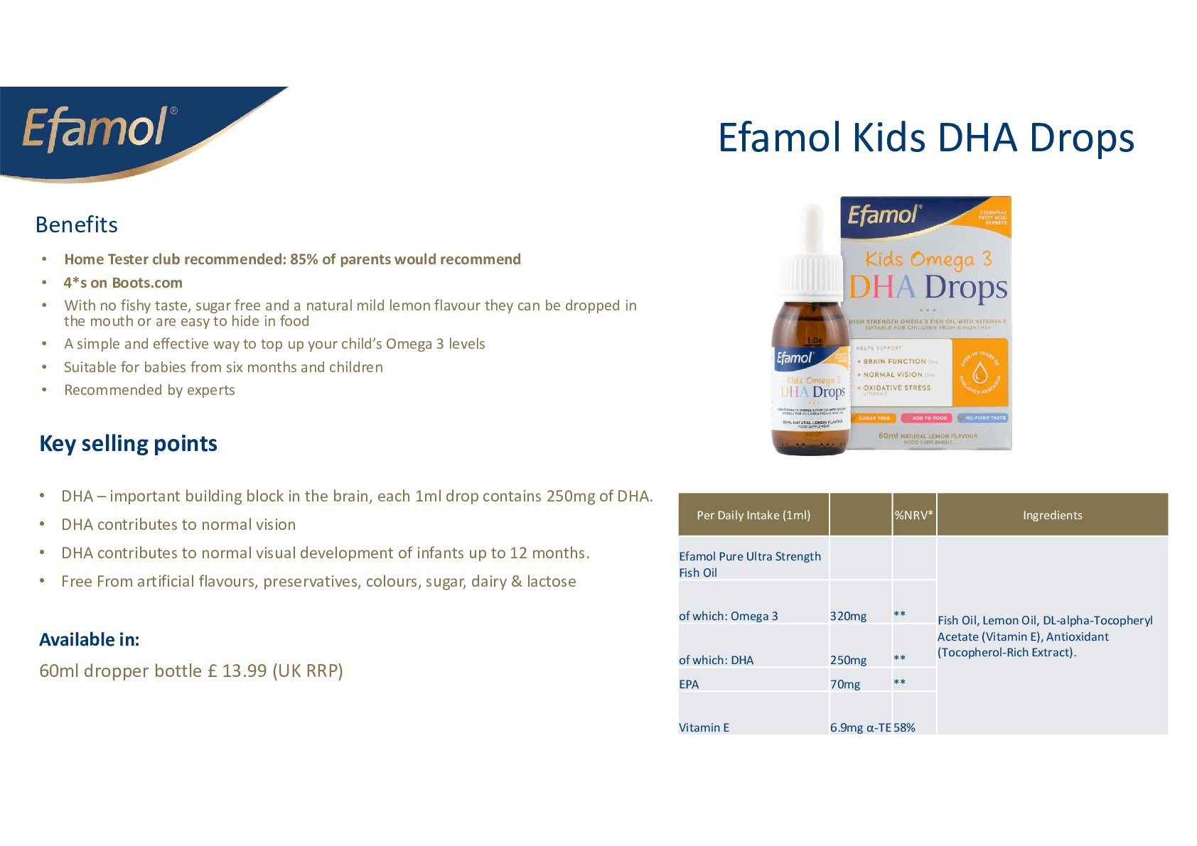 Efamol Kids Omega 3 DHA Drops is a liquid supplement to support children's brain health and vision. Containing a carefully sourced fish oil, with a mild natural lemon flavour and no fishy aftertaste.