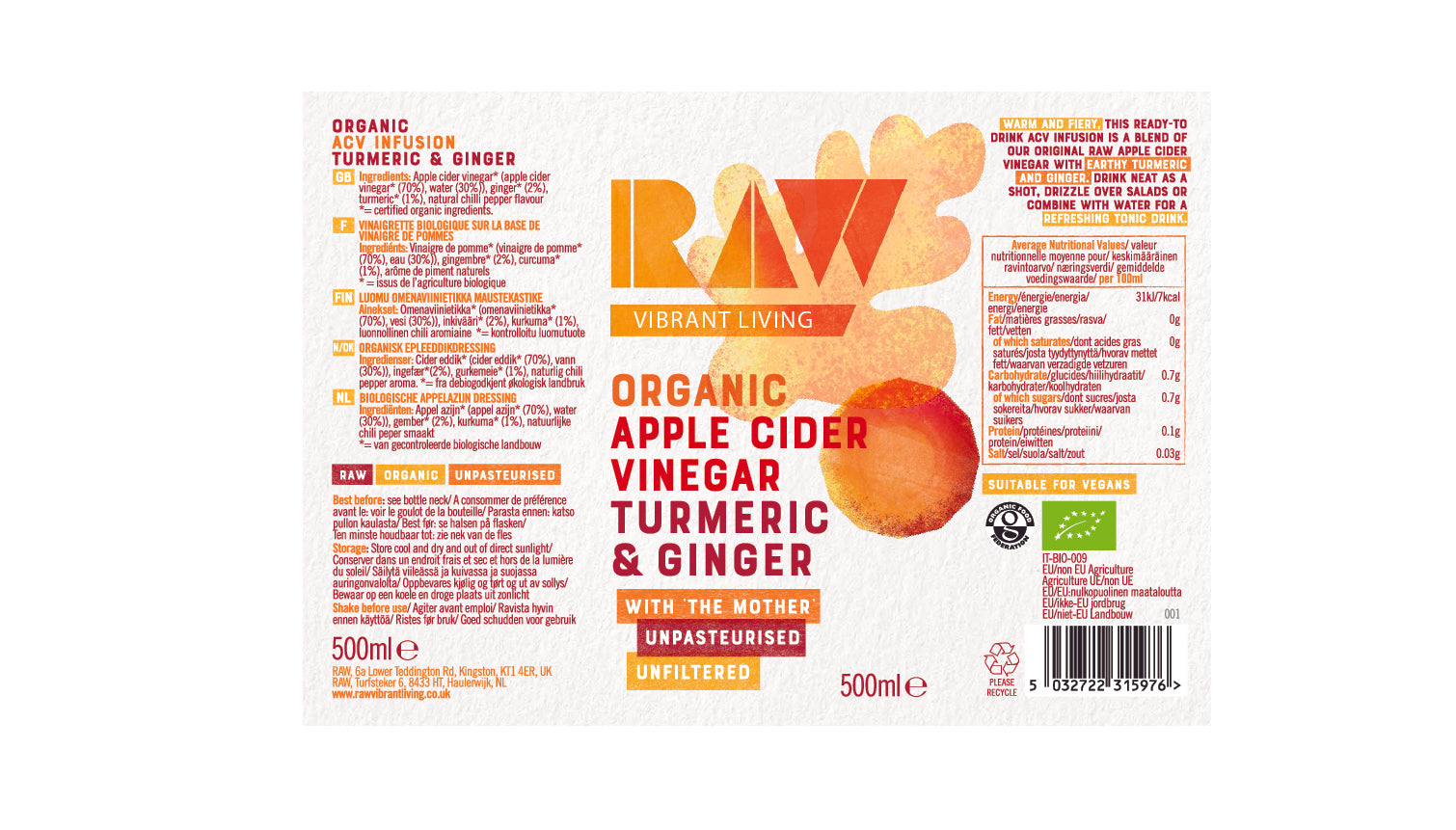 Raw Apple Cider Vinegar Blend with Turmeric Ginger Organic - Mix -Blend -Dress