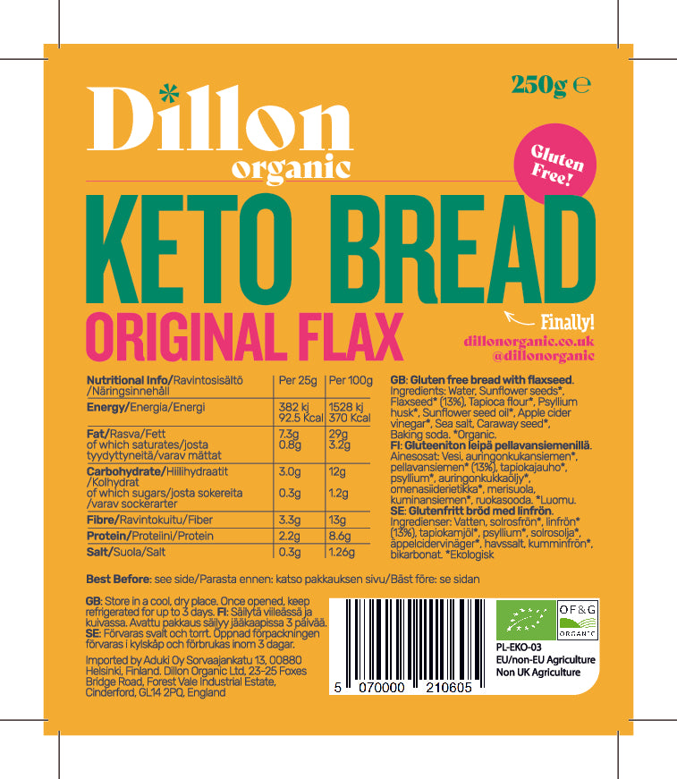 This is our original Organic Keto bread made with a blend of flax, sunflower seeds, and caraway seeds for flavour. It comes as an unsliced half loaf and that gives you the freedom to choose which thickness you'd like to make your slice. Great toasted or double toasted and made into an open sandwich. It is delicious tasting bread that helps keep you fuller for longer, and replaces the need to reach for a high carb loaf with a healthy, keto based alternative.