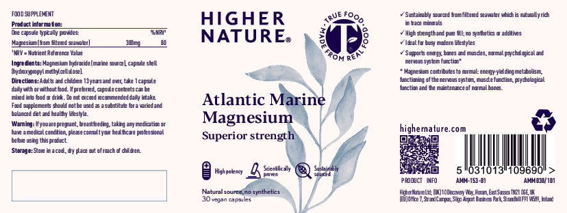 Superior strength magnesium. Sustainably sourced from filtered seawater which is naturally rich in trace minerals. Supports energy, bones and muscles, normal psychological and nervous system function