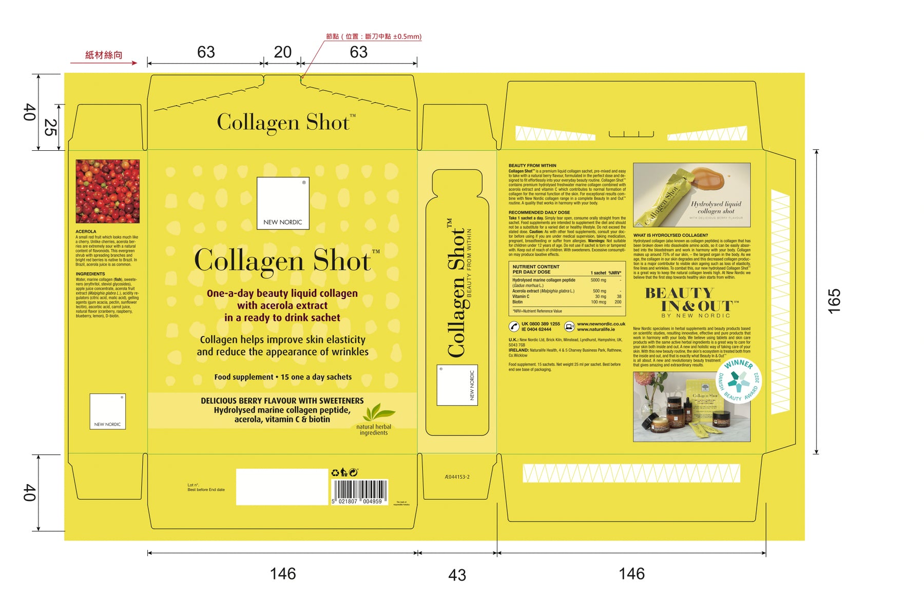 Collagen Shot is a premium liquid collagen sachet, pre-mixed and easy to take with a natural berry flavour, formulated in the perfect dose and designed to fit effortlessly into your everyday beauty routine. Collagen Shot contains premium hydrolysed freshwater marine collagen combined with acerola extract and vitamin C which contributes to normal formation of collagen for the normal function of the skin.