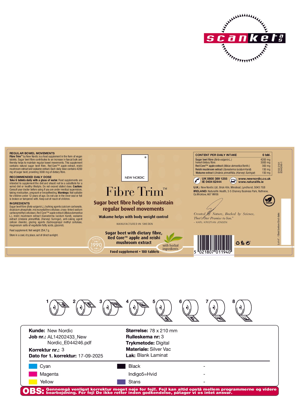 Fibre Trim by New Nordic is a food supplement in the form of vegan tablets. Sugar beet fibre contributes to an increase in faecal bulk and thereby helps to maintain regular bowel movements. This supplement contains natural sugar beet fibre, Red Core apple extract, reishi mushroom extract and wakame extract. Each daily dose contains 4200mg of sugar beet, providing 3000 mg of dietary fibre.