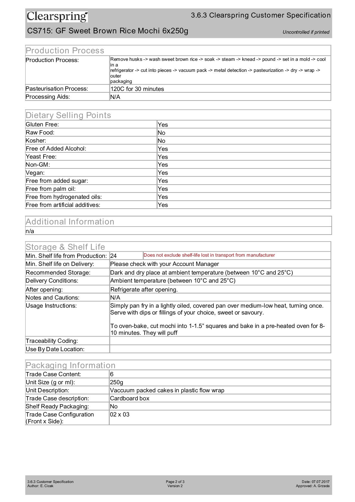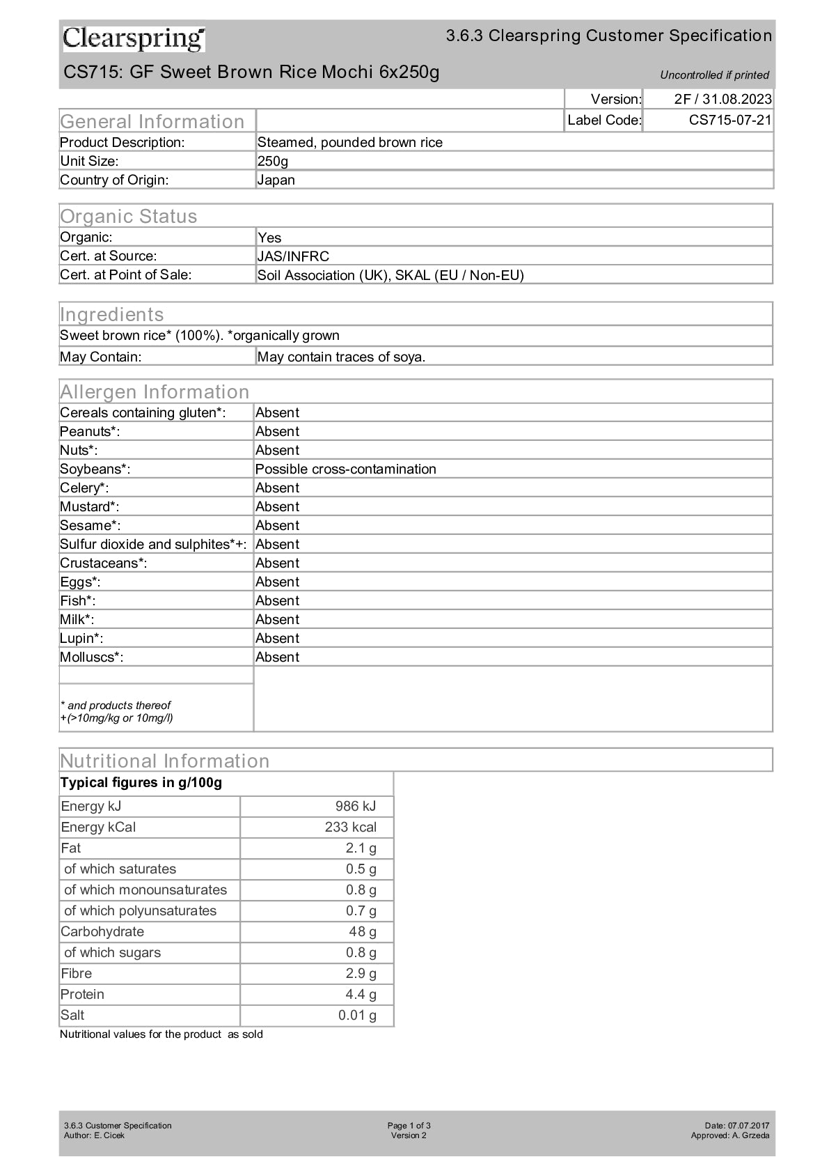 Sweet brown rice* (100%). *organically grown