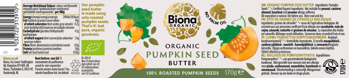 Biona Organic Pumpkin Seed Butter is milled from small batches of freshly roasted seeds from certified organic pumpkins - and that's it! We never use palm fat or emulsifiers, only the pumpkin seed kernels which means you receive all their nutrient rich goodness and taste. Pumpkin Seed Butter makes a great change from Peanut, Almond or alternative butters. Slather it on toast to enjoy its rich, smooth flavour or drizzle with honey for a sweeter taste.