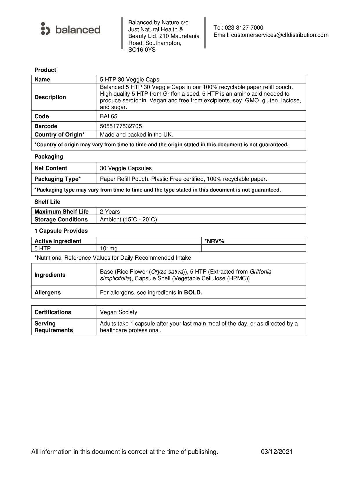 Balanced 5 HTP 30 Veggie Caps in our 100% recyclable paper refill pouch. High quality 5 HTP from Griffonia seed. 5 HTP is an amino acid needed to produce serotonin. Vegan and free from excipients, soy, GMO, gluten, lactose and sugar. For nutritional information and ingredients, click Further Information.