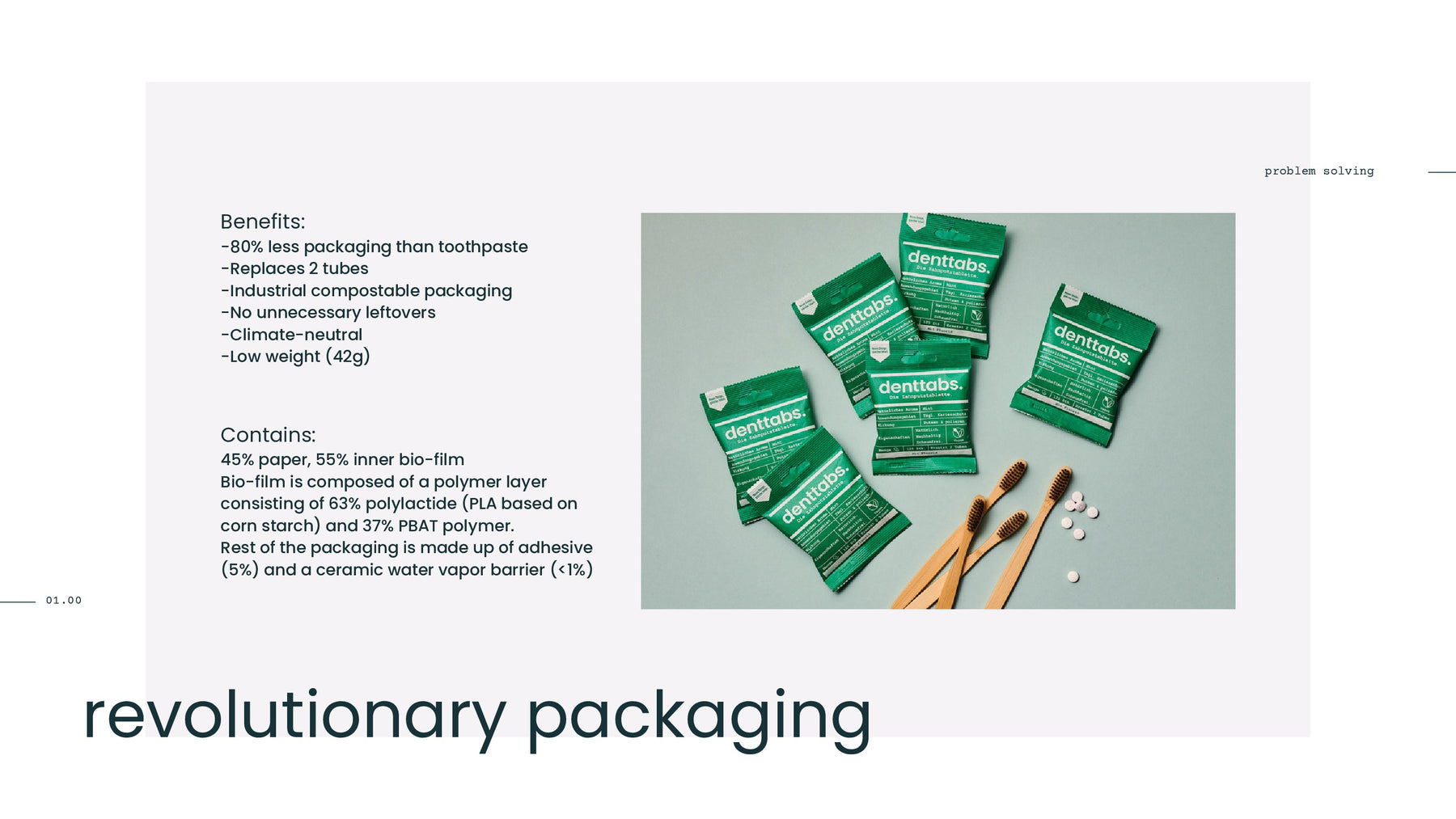 Denttabs Mint toothpaste tabs with fluoride for adults go beyond brushing: They polish your teeth until they're smooth, thanks to the high content of cellulose. Developed by dentists. Natural, sustainable, foam-free.