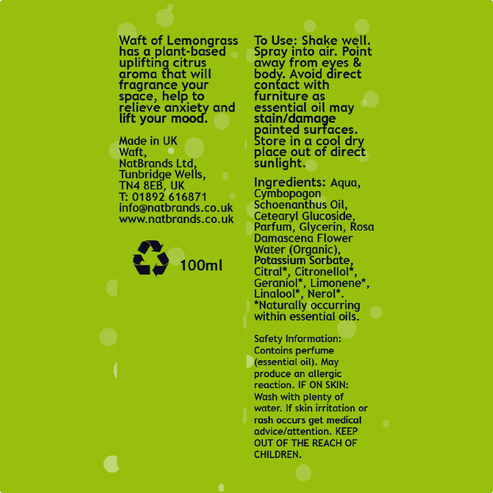 ring a delightful waft of plant-based natural fragrance into your home. Waft Lemongrass is one of our 98.5 percent organic signature aromatic air freshener blends. Waft Lemongrass has an uplifting fresh citrus aroma that helps to relieve anxiety and lift feelings. The stylish has a vibrantly coloured label that represent a burst of fragrance and will look stylish anywhere around your home.