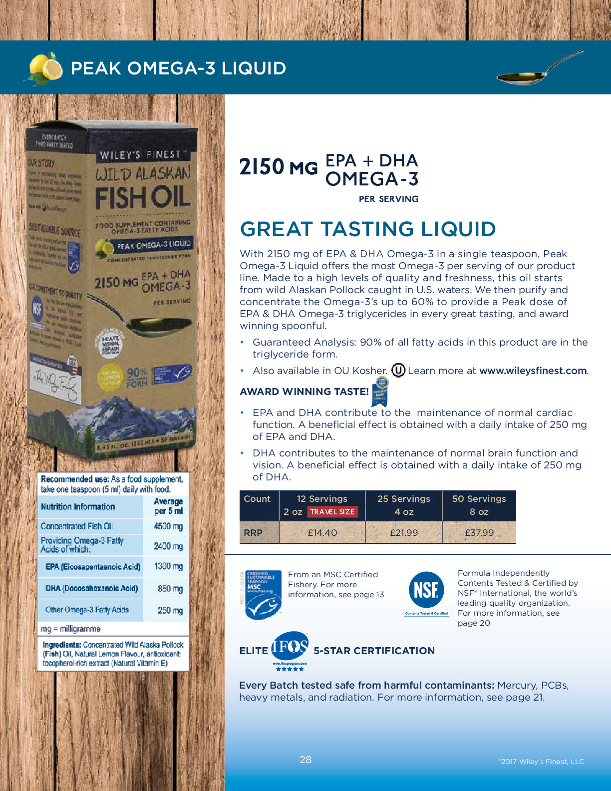 With 2150 mg of EPA & DHA Omega-3 in a single teaspoon, Peak Omega-3 Liquid offers the most Omega-3 per serving of our product line. Made to a high level of quality and freshness, this oil starts from wild Alaskan Pollock caught in the U.S. waters. We then purify and concentrate the Omega-3's up to 60% to provide a Peak dose of EPA & DHA Omega-3 triglycerides in every great tasting, and award winning spoonful.